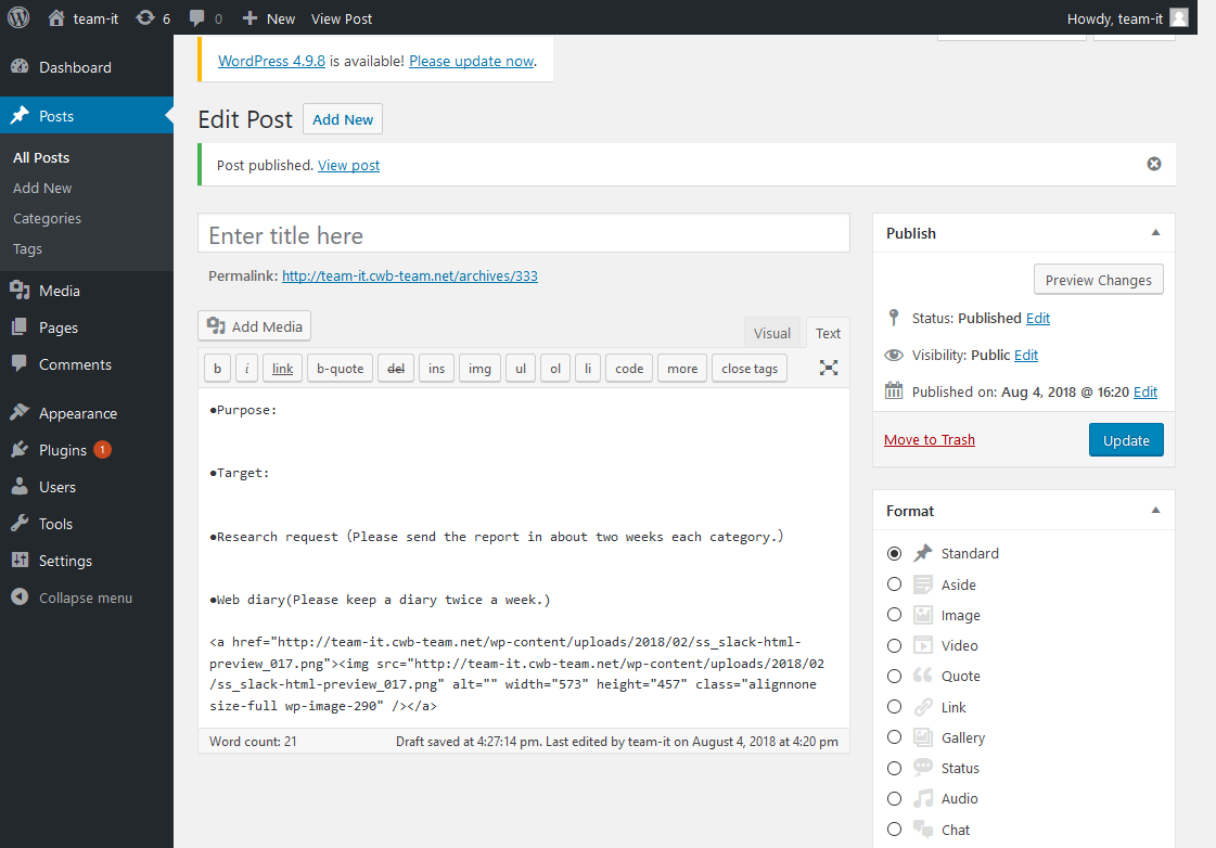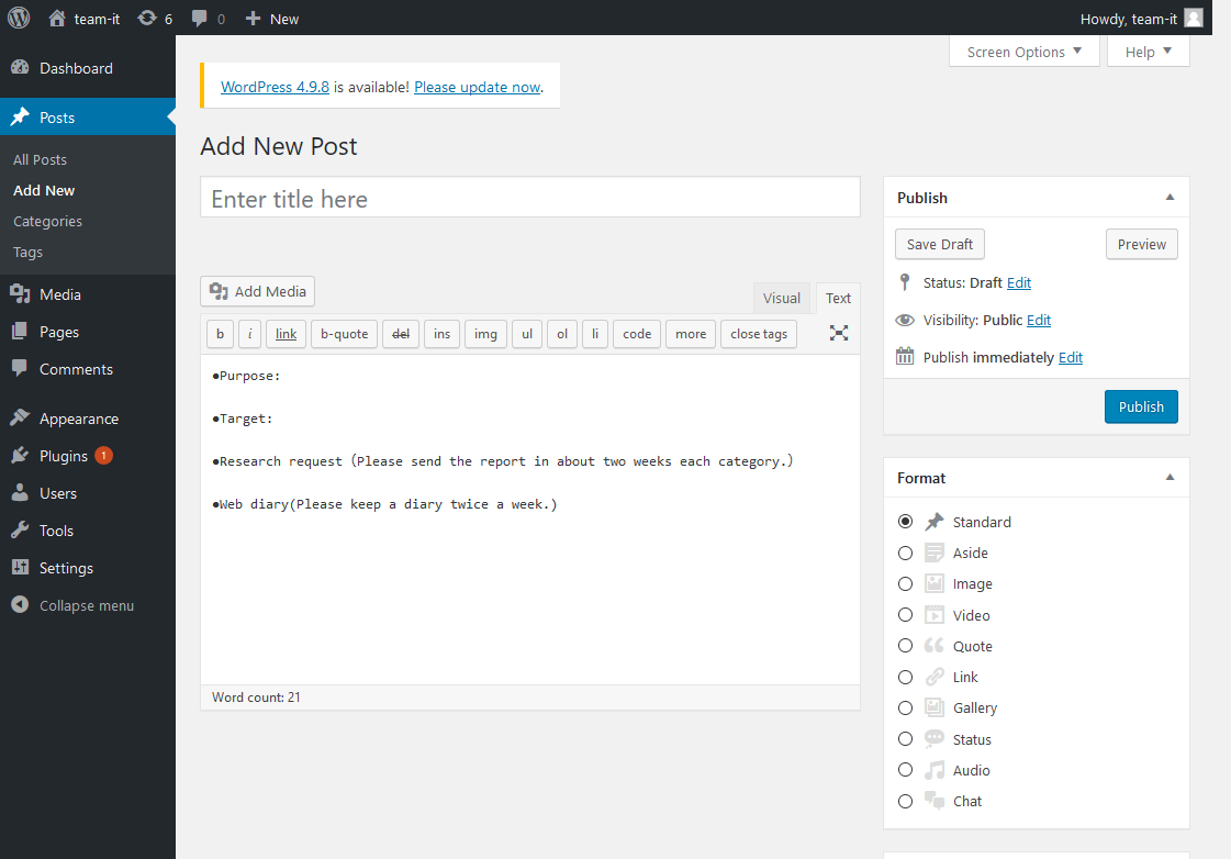 記事の内容を入力する枠の右上にあるタブの「Text」を「Visual」に変更することで、