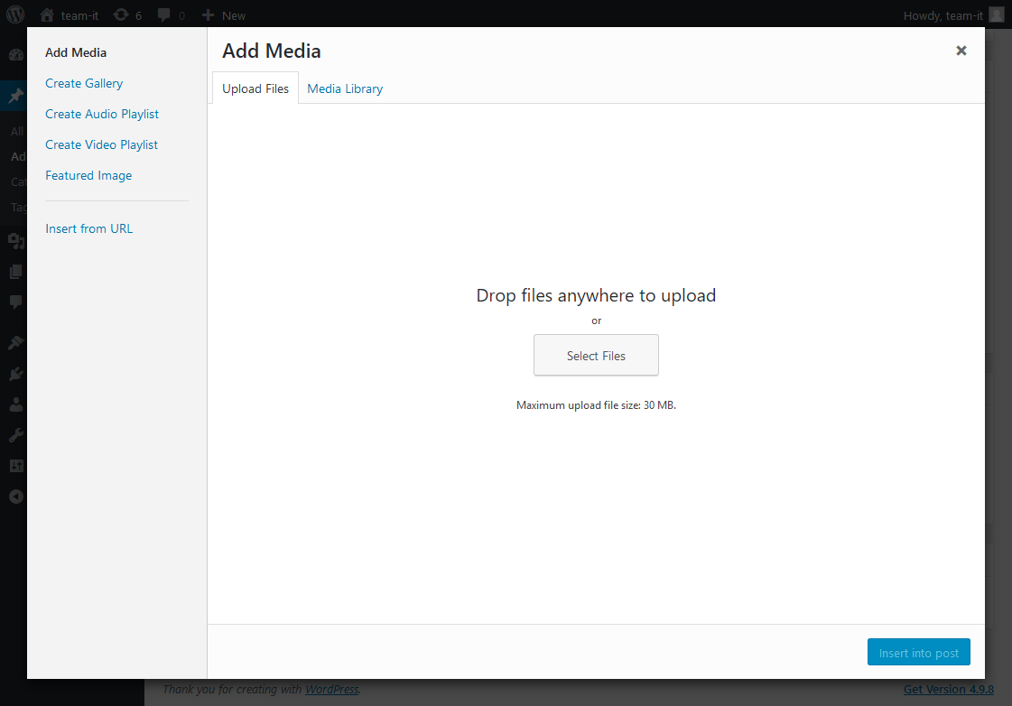 「Add Media」をクリックし、「Upload Files」を選択する。