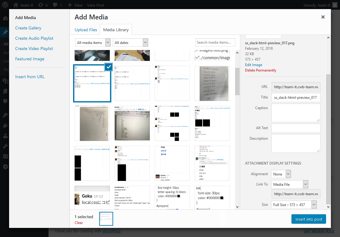 「Size」項目を「Full Size」に選択して「Insert into post」をクリックする。(こうすることで、元画像のサイズが保持されます)