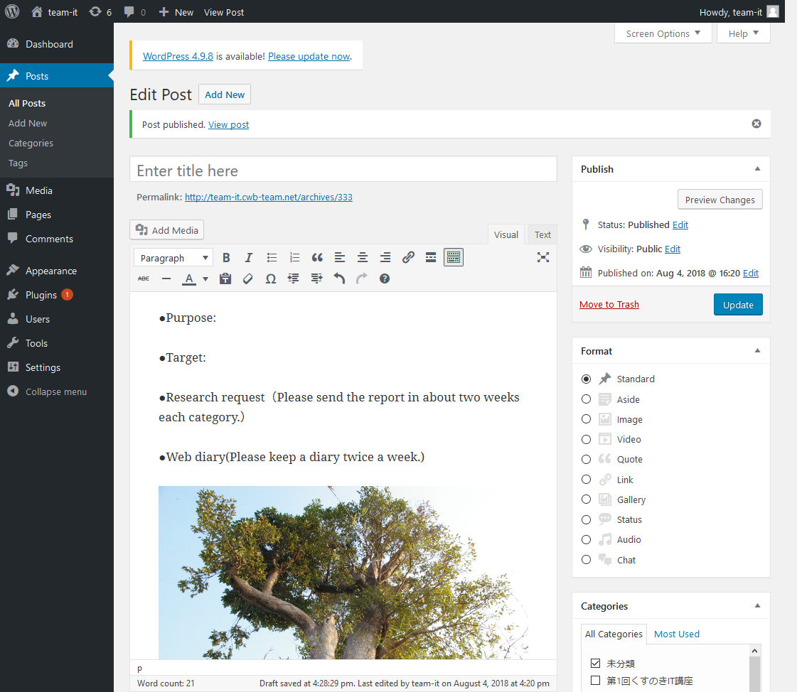 記事の入力が完了したら、「Publish」をクリックしてください。